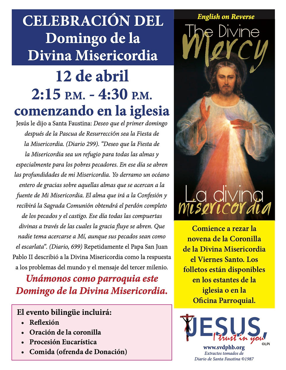 Invitamos a todos a recibir los sacramentos de la Confesión (dentro de un plazo razonable) y de la Santa Comunión en el Domingo de la Divina Misericordia, para acoger plenamente la generosidad de la misericordia de Jesús.